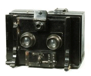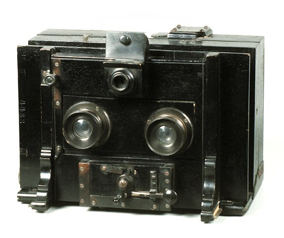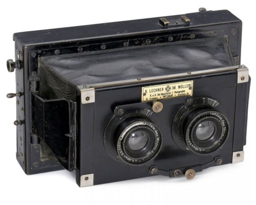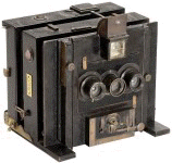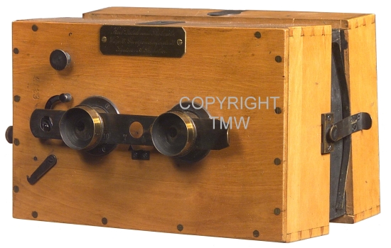 Wanaus, Wien, ca. 1895Josef Wanaus, Wien; Stereokamera mit 2 symmetrischen Goerz Anastigmaten mit Revolverblende für Platten 9x18cm. |