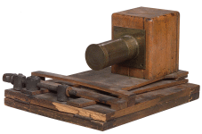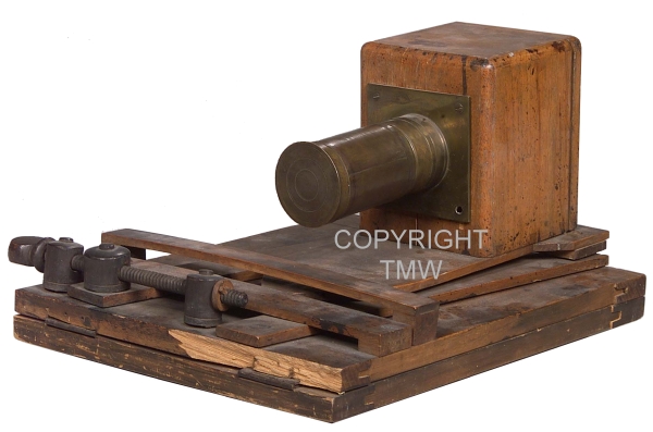Unbezeichnete Nassplattenkamera, ca. 1860;Hersteller unbekannt, Serien# 1 in das Holz eingeschlagen. |