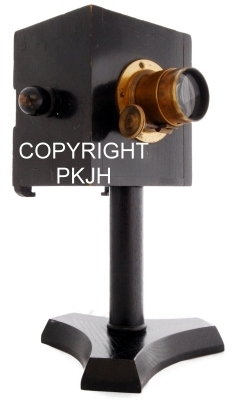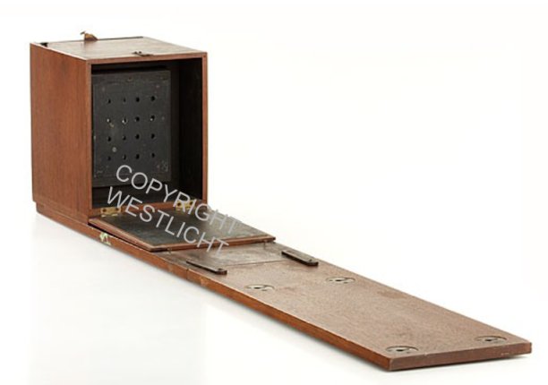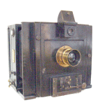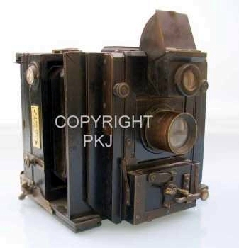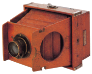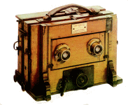 VOIGTLÄNDER Metallkamera, 1841P.F.W. Voigtländer, Wien; Petzval-Objektiv 3,7/149mmca. 93mm Durchmesser Die Serienproduktion begann 1841 und endete ca. 1860. Die Anzahl wird auf ca. 1000 Stück (Afalter) geschätzt. Die ersten Repliken (25 Stück) wurden schon im Jahr 1938 von Voigtländer hergestellt. Anläßliche der 200-Jahrfeier der Firma Voigtländer im Jahr 1956 wurden in der Lehrwerkstätte der Firma 200 Repliken hergestellt die alle die Seriennummer 84 tragen. 1972 ließ ein privater Sammlerkreis weitere 100 Stück mit der Seriennummer 84 herstellen die auf der Unterseite des Statives von 1-100 CA graviert sind und von der Firma Camera Antica in Stuttgart um 2600 DM verkauft wurden. |
