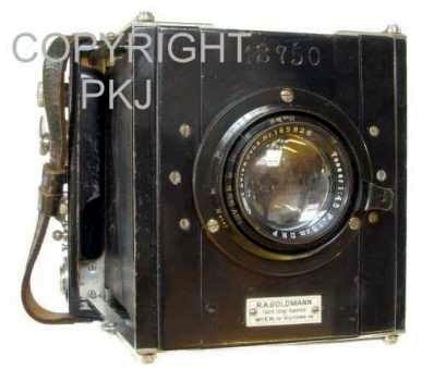 GOLDMANN, ca. 1896; Serien# 10021R.A.Goldmann, Wien; Spreizenkamera 8,5x11cm mit C.P.Goerz Doppel Anastigmat Serie III/0, F=112mm; Schlitzverschluß- Kamera mit angesetzter Auszugsverlängerung. |